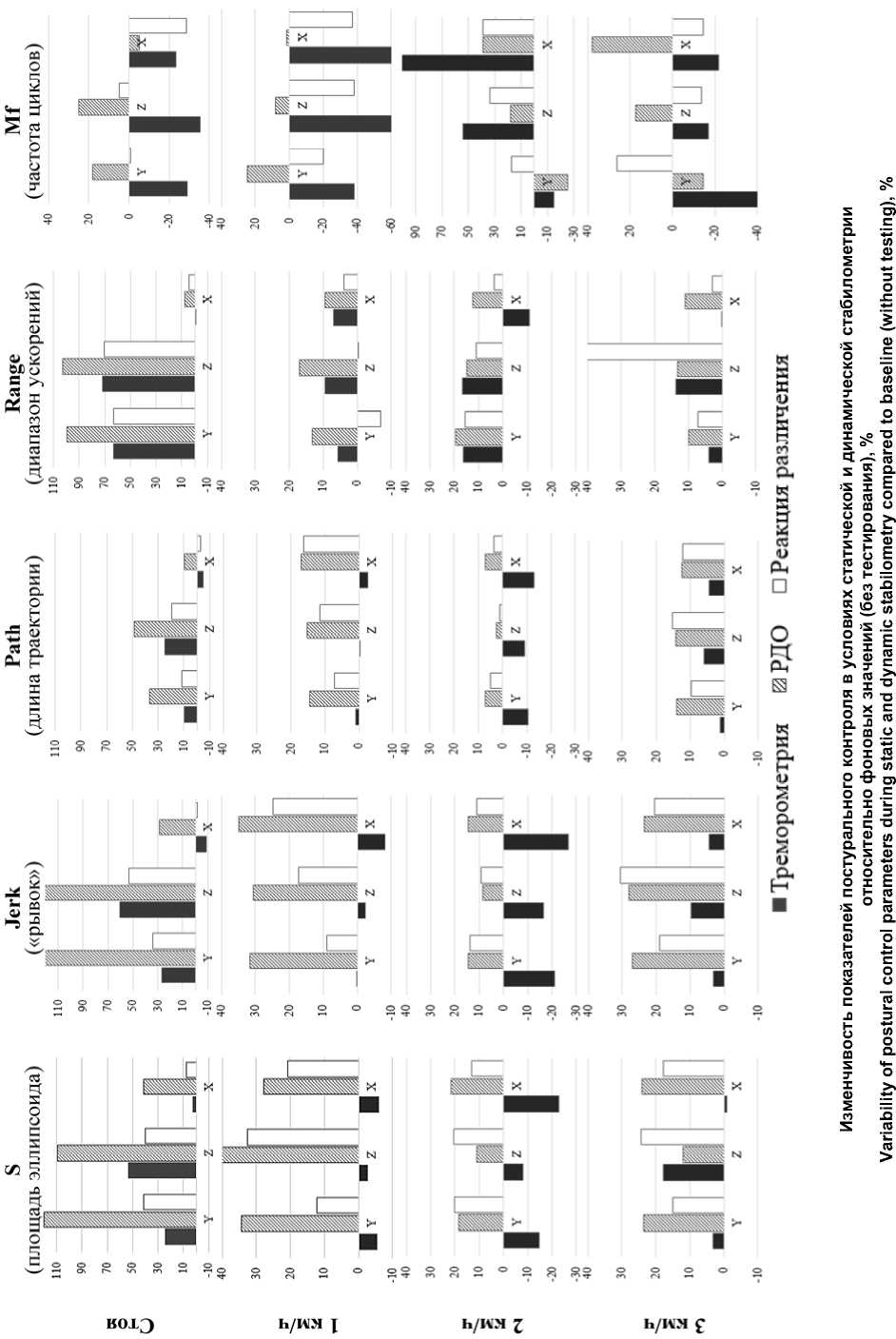 Постуральный баланс оценивался с помощью инерционного сенсора, закрепленного на уровне крестца у обследуемого. Регистрировались параметры ускорения центра масс (колебания тела) в трех взаимно перпендикулярных плоскостях: фронтальной (Y – колебания вперед – назад), горизонтальной (Z – вверх – вниз) и сагиттальной (X – вправо – влево): S – площадь проекции 95 % доверительного эллипсоида ускорения; Jerk – рывок как производная от ускорения по времени (диапазон изменений акселерометрического сигнала); Path – длина траектории по ускорению; Range – диапазон ускорений; Mf – средняя частота (число циклов в секунду, которое должно быть пройдено чтобы покрыть траекторию по ускорению). Методология интерпретации указанных параметров следующая: увеличение их значений свидетельствует о снижении постуральной устойчивости; тело совершает больше колебаний, движения становятся более резкими (высокий Jerk) и менее плавными; снижение частоты (Mf) – о более медленных, корректирующих колебаниях, что также трактуется как признак напряжения системы постурального контроля.