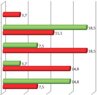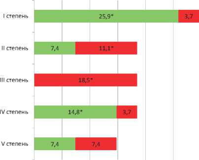 Как можно увидеть из данных, отраженных на рисунке 1, повреждения I степени отмечены в 8 (29,6 %) наблюдения, соответственно, в группе А – в 7 (25,9 %), в группе Б – в 1 (3,7 %) случаях (r = 0,76, p < 0,05). Повреждения II степени – в 5 (18,5 %), в группе А – в 2 (7,4 %), в группе Б – в 3 (11,1 %) наблюдениях (r = 0,66, p < 0,05). III степени – в 5 (18,5 %) наблюдениях, во всех случаях в группе Б. IV степени – у 5 (18,5 %) раненых, в группе А – в 4 (14,8 %), в группе Б – в 1 (3,7 %) наблюдениях (r = 0,76, p < 0,05). V степени – в 4 (14,8 %), соответственно, 2 (7,4 %) и 2 (7,4 %) (r = 0,12, p > 0,05). Таким образом можно отметить, что в группе А преобладали повреждения I степени, тогда как в группе Б – III степени.