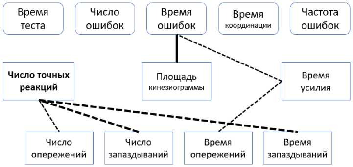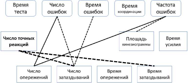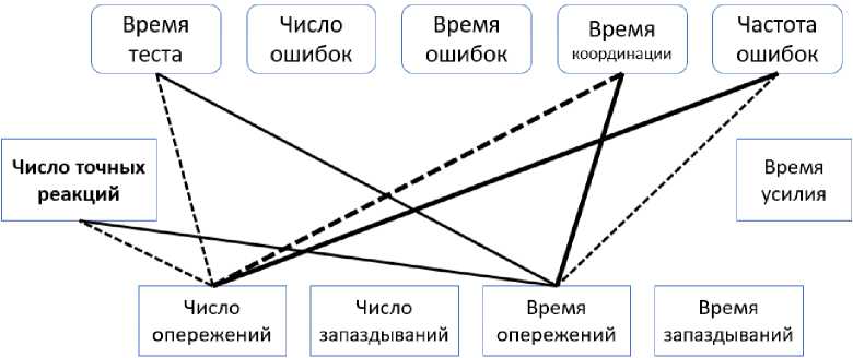 Рис. 1. Функциональные связи показателей произвольной регуляции усилий и движений у спортсменов в динамике нагрузочного тестирования и восстановления