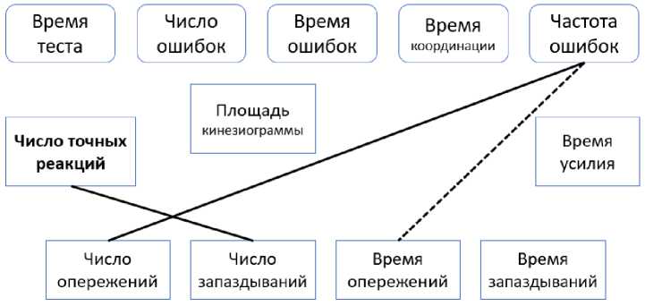 Спортсмены после 10 минут отдыха после выполнения функциональной пробы. Частота касаний в тесте «Динамическая треморо-метрия» имеет положительную взаимосвязь с числом опережений (r = 0,637 при p = 0,019) и отрицательную – с суммой времени опережений (r = –0,559 при p = 0,047) в тесте «РДО». При этом число точных реакций в этом же тесте коррелирует с числом запаздываний (r = –0,620 при p = 0,024).