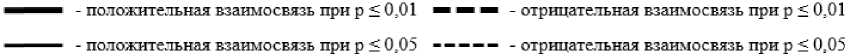 положительная взаимосвязь при р < 0:01 ™ ™ ™ - отрицательная взаимосвязь при р < 0:01 положительная взаимосвязь при р < 0.05 ----- - отрицательная взаимосвязь при р < 0:05
