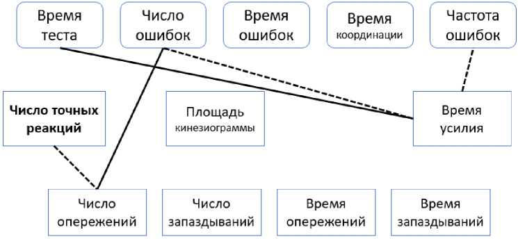 Неспортсмены после 10 минут отдыха после выполнения функциональной пробы . Установлена положительная взаимосвязь количества ошибок в тесте «Динамическая треморо-метрия» с числом опережений в тесте «РДО» (r = 0,648 при p = 0,043), при этом последнее отрицательно коррелирует с числом точных реакций в этом же тесте (r = –0,663 при p = 0,037). На данном этапе наблюдения установлен ряд корреляций продолжительности удержания усилия в заданных пределах (тест «Динамометрия») с показателями время тестирования (r = 0,640 при p = 0,046), количеством ошибок (r = –0,683 при p = 0,03) и с частотой ошибок (r = –0,720 при p = 0,019) в тесте «Динамическая треморометрия» (см. рис. 2).