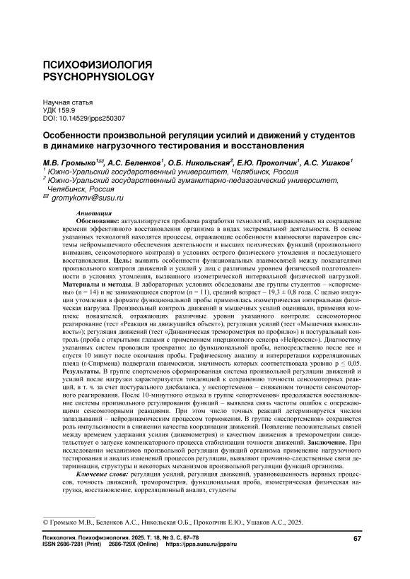 Обоснование: актуализируется проблема разработки технологий, направленных на сокращение времени эффективного восстановления организма в видах экстремальной деятельности. В основе указанных технологий находятся процессы, отражающие особенности взаимосвязи параметров системы нейромышечного обеспечения деятельности и высших психических функций (произвольного внимания, сенсомоторного контроля) в условиях острого физического утомления и последующего восстановления. Цель: выявить особенности функциональных взаимосвязей между показателями произвольного контроля движений и усилий у лиц с различным уровнем физической подготовленности в условиях утомления, вызванного изометрической интервальной физической нагрузкой. Материалы и методы. В лабораторных условиях обследованы две группы студентов – «спортсмены» (n = 14) и не занимающиеся спортом (n = 11), средний возраст – 19,3 ± 0,8 года. С целью индукции утомления в формате функциональной пробы применялась изометрическая интервальная физическая нагрузка. Произвольный контроль движений и мышечных усилий оценивали, применяя комплекс показателей, отражающих различные уровни указанного контроля: сенсомоторное реагирование (тест «Реакция на движущийся объект»), регуляция усилий (тест «Мышечная выносливость»); регуляция движений (тест «Динамическая треморометрия по профилю») и постуральный контроль (проба с открытыми глазами с применением инерционного сенсора «Нейросенс»). Диагностику указанных систем проводили троекратно: до функциональной пробы, непосредственно после нее и спустя 10 минут после окончания пробы. Графическому анализу и интерпретации корреляционных плеяд (r-Спирмена) подвергали взаимосвязи, значимость которых соответствовала уровню p ≤ 0,05. Результаты. В группе спортсменов сформированная система произвольной регуляции движений и усилий после нагрузки характеризуется тенденцией к сохранению точности сенсомоторных реакций, в т. ч. за счет постурального дисбаланса, у неспортсменов – снижением точности сенсомоторного реагирования. После 10-минутного отдыха в группе «спортсменов» продолжается восстановление системы произвольного регулирования функций – выявлена связь частоты ошибок с опережающими сенсомоторными реакциями. При этом число точных реакций детерминируется числом запаздываний – нейродинамическим процессом торможения. В группе «неспортсменов» сохраняется роль импульсивности в снижении качества координации движений. Появление положительных связей между временем удержания усилия (динамометрия) и качеством движения в треморометрии свидетельствует о запуске компенсаторного процесса стабилизации точности движений. Заключение. При исследовании механизмов произвольной регуляции функций организма применение нагрузочного тестирования и анализ изменений процессов регуляции, выявляют причинно-следственные связи детерминации, структуры и некоторых механизмов произвольной регуляции функций организма.