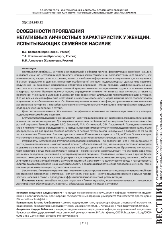 в семьях, где женщины подвергаются домашнему насилию [Кожевникова, Костарев, 2025; Куф-тяк и др., 2025; Дериш, 2021; Гончаренко, Куфтяк, 2024; Walker et al., 2022]. Анализ исследований в этой области показал, что они посвящены в основном поиску психологических особенностей жертв насилия. В то же время практически не исследуются такие проявления негативных черт личности женщин, как нарциссизм, макиавеллизм, психопатия.