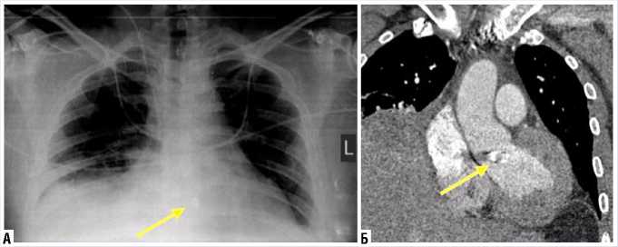Рис. 1. А – рентгенограмма органов грудной клетки, прямая проекция; Б – КТ-ангиограмма (режим MPR): инородное тело в проекции сердца.