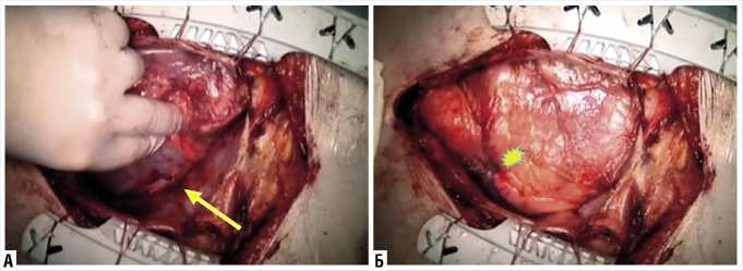Рис. 2. А – фибриновый налет и гематома стенки правого предсердия в зоне, совпадающей с раневым дефектом перикарда (входное отверстие, обозначено стрелкой); Б – звездочкой отмечена предполагаемая проекция места расположения инородного тела на переднюю поверхность сердца.