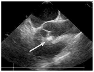 Рис. 3. ЧП ЭхоКГ: инородное тело в верхней трети МЖП, под правой коронарной створкой аортального клапана (стрелка).