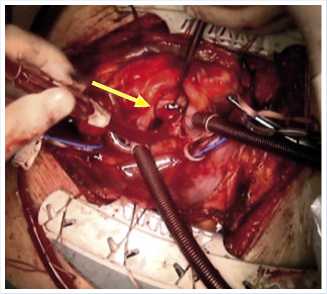 «аорта – полые вены». Зажим на аорту. Антеградная фармакохолодовая кардиоплегия. Вскрыто правое предсердие. При ревизии повреждений трикуспидального клапана, доступной части правого желудочка – не выявлено. Выполнена продольная аортотомия. При ревизии – тромботические массы в правом коронарном синусе аортального клапана (Рис. 4) – удалены.