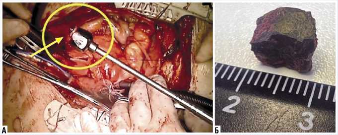 Рис. 5. А – в полость левого желудочка помещен неодимовый магнит, эвакуировано инородное тело; Б - извлеченное инородное тело (осколок) размерами 1,3 х 0,9 см.
