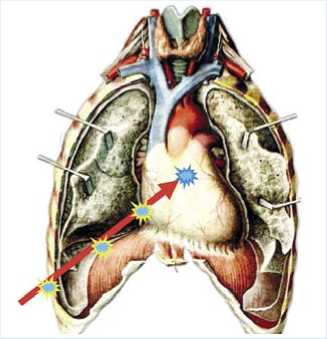 Рис. 6. Вероятная траектория проникновения инородного тела в сердце.
