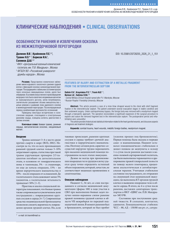 сердечно-сосудистой хирургии. Способ применялся уже в ходе Первой мировой и Великой Отечественной войны и в последующих вооруженных конфликтах [13]. Следует принимать во внимание, что неодимовые магниты достаточно хрупкие; помимо этого, они могут утрачивать свои магнитные свойства при нагревании даже до относительно невысоких температур (более 80 °C). Учитывая это, перед оперативным вмешательством была проведена плазменная низкотемпературная стерилизация магнита. Еще один факт, связанный с использованием магнитов, – сила его притяжения должна соответствовать поставленной задаче: стремительное прикрепление к нему металлического тела может привести к ятрогенному повреждению миокарда в процессе извлечения. В данном наблюдении удалось извлечь осколок из толщи МЖП, избежав дополнительной травмаы сердечных структур.