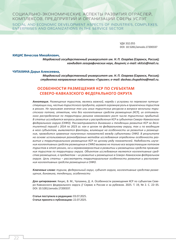 Размещение туристов, являясь важной, наряду с услугами по перевозке путешествующих лиц, частью туристского продукта, играют огромную роль в привлечении туристов в регион. Не принижая значение тех или иных туристских ресурсов в вопросе величины туристского потока, отметим, что без коллективных средств размещения (КСР), их оптимального распределения по территории региона невозможен рост числа туристских прибытий. В статье исследуются вопросы развития и распределения КСР в субъектах Северо-Кавказского федерального округа (СКФО). Рассматриваются динамика и тенденции развития КСР за десятилетний период с 2014 по 2023 гг. как в целом по федеральному округу, так и по входящим в него субъектам, выявляются факторы, влияющие на особенности их развития и размещения, проводится сравнение полученных показателей между субъектами СКФО. В результате на основе использования разнообразных методов исследования определены особенности развития и территориального размещения КСР по целому ряду показателей. Надобность изучения коллективных средств размещения в СКФО вызвана не только все возрастающим потоком туристов в этот регион, но и неравномерностью в развитии и размещении средств проживания туристов по территории округа. Объектом исследования являются коллективные средства размещения, а предметом – их развитие и размещение в Северо-Кавказском федеральном округе. Цель статьи – рассмотреть территориальные особенности развития и расположения коллективных средств размещения в СКФО.