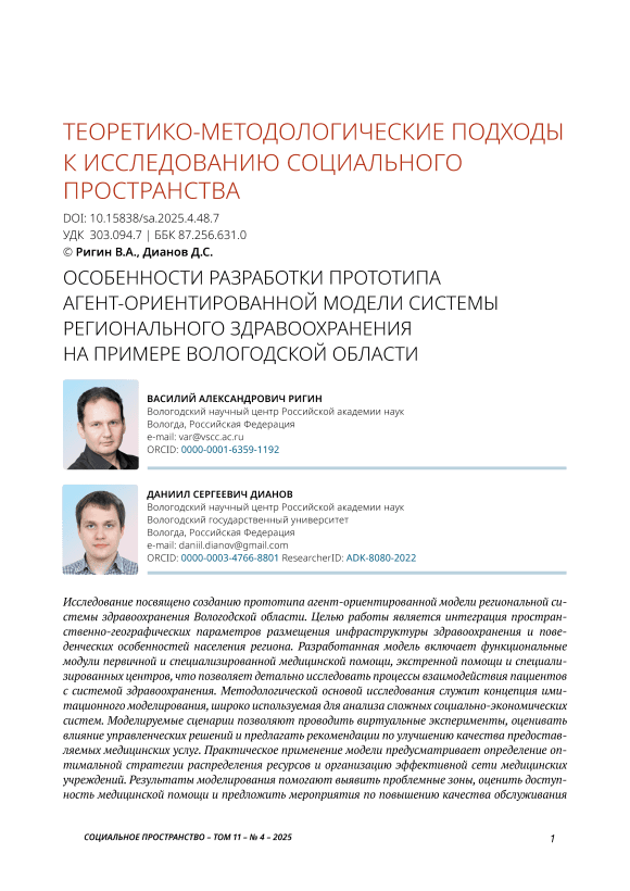 Исследование посвящено созданию прототипа агент-ориентированной модели региональной системы здравоохранения Вологодской области. Целью работы является интеграция пространственно-географических параметров размещения инфраструктуры здравоохранения и поведенческих особенностей населения региона. Разработанная модель включает функциональные модули первичной и специализированной медицинской помощи, экстренной помощи и специализированных центров, что позволяет детально исследовать процессы взаимодействия пациентов с системой здравоохранения. Методологической основой исследования служит концепция имитационного моделирования, широко используемая для анализа сложных социально-экономических систем. Моделируемые сценарии позволяют проводить виртуальные эксперименты, оценивать влияние управленческих решений и предлагать рекомендации по улучшению качества предоставляемых медицинских услуг. Практическое применение модели предусматривает определение оптимальной стратегии распределения ресурсов и организацию эффективной сети медицинских учреждений. Результаты моделирования помогают выявить проблемные зоны, оценить доступность медицинской помощи и предложить мероприятия по повышению качества обслуживания населения. Таким образом, представленная работа направлена на повышение эффективности функционирования региональной системы здравоохранения и формирование комплекса мер, ориентированных на конкретные региональные потребности и характеристики населения. Это способствует принятию научно обоснованных управленческих решений, направленных на достижение целей устойчивого развития региона в области охраны здоровья населения.