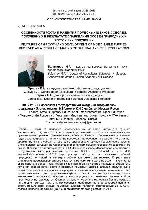Соболь – один из наиболее востребованных объектов клеточного пушного звероводства. Шкурки соболя пользуются устойчивым спросом на международных пушно-меховых рынках. Селекционная работа в области соболеводства в прежние годы была направлена на получение продукции однородной по окраске, что отличает шкурки клеточного соболя от цветового разнообразия шкурок промыслового соболя. Сложившаяся ситуация не удовлетворяет в полном объеме требования современного рынка. В связи с этим специалисты ООО «Звероплемзавод «Савватьево» совместно с сотрудниками кафедры частной зоотехнии ФГБОУ ВО МГАВМ и Б – MВА имени К.И.Скрябина с 2019 года проводят работу по использованию соболей природных популяций в селекции соболя клеточного разведения. В результате спариваний промысловых самцов с клеточными самками с 2019 по 2025 гг. в хозяйстве было получено более 1 тыс. помесных щенков. B данной статье приведены результаты изучения особенностей роста и развития помесных щенков соболей, полученных в результате спаривания особей природных и клеточных популяций. Установлено, что сроки появления слуха, прорезывания зубов, открытия глаз, выхода из гнезда, смены ювенального волосяного покрова у чистопородных и помесных щенков соболя практически не отличаются. Осенняя линька у помесного молодняка была в среднем на 7,5 дней дольше, чем у чистопородного. Наиболее часто встречаемой причиной дорегистрационного отхода помесных щенков является мертворождение (27,3%), травма, нанесенная самкой (18,2%) и отсутствие молока у самки (18,2%).