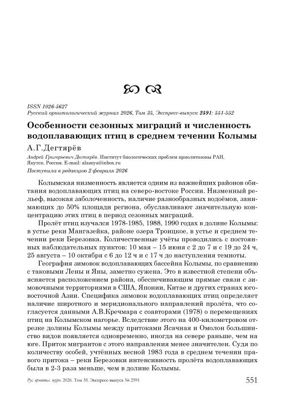 Особенности сезонных миграций и численность водоплавающих птиц в среднем течении Колымы