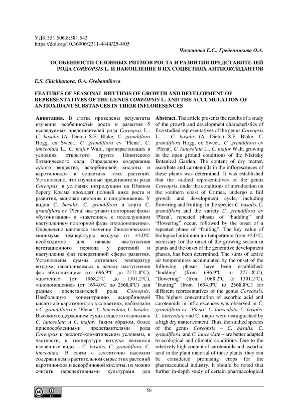 Особенности сезонных ритмов роста и развития представителей рода Coreopsis L. и накопление в их соцветиях антиоксидантов