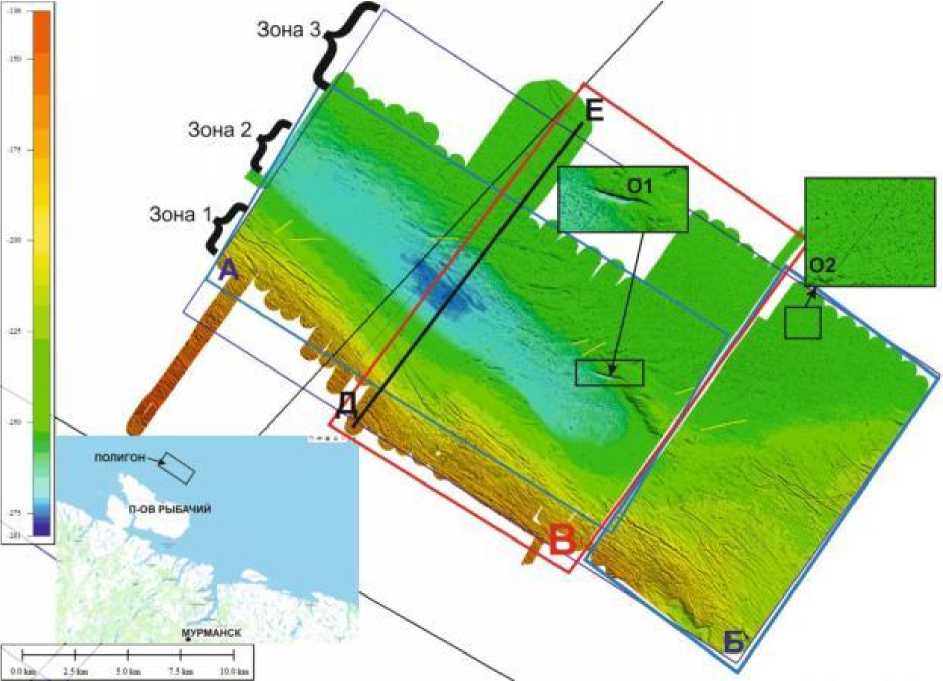 Рис. 1. Положение полигона. Цифровая модель рельефа дна полигона ( Сорохтин и др., 2024 , с изменениями и дополнениями): А, Б – участки полигона; В – участок полигона, на котором построены карты изохрон отражающих горизонтов (рис. 4); Д, Е – профиль Parasound [см. рис. 2; О1 – объекты типа 1; О2 – объекты типа 2]. Слева – шкала глубин