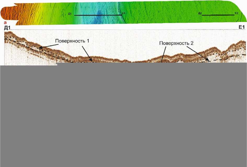 Изохроны горизонта 2 (рис. 4, в ) повторяют рисунок изохрон поверхности 1 и дна лишь частично, что свидетельствует о резком несогласии и подтверждает вывод о границе сейсмического комплекса регионального масштаба (акустический фундамент). В северной части полигона поверхность местами прерывается, чему на сейсмических разрезах соответствуют области, на которых невозможно уверенно коррелировать отражающие площадки и выделить горизонт (рис. 5, в ). В то же время непосредственно над зоной ослабления сигнала в рельефе дна виден объект 1 (борозда выпахивания) и отражения под ним, повторяющие этот рельеф. Отражения не являются кратными, поскольку сохраняют угол наклона и нигде более кратность не прослеживается.