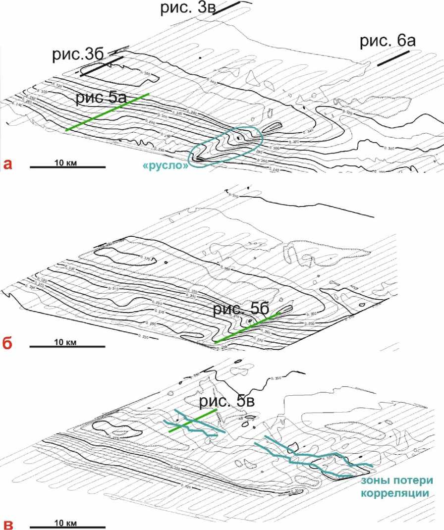 Рис. 4. Карты изохрон: а – изохроны дна; б – поверхность 1; в – поверхность 2.