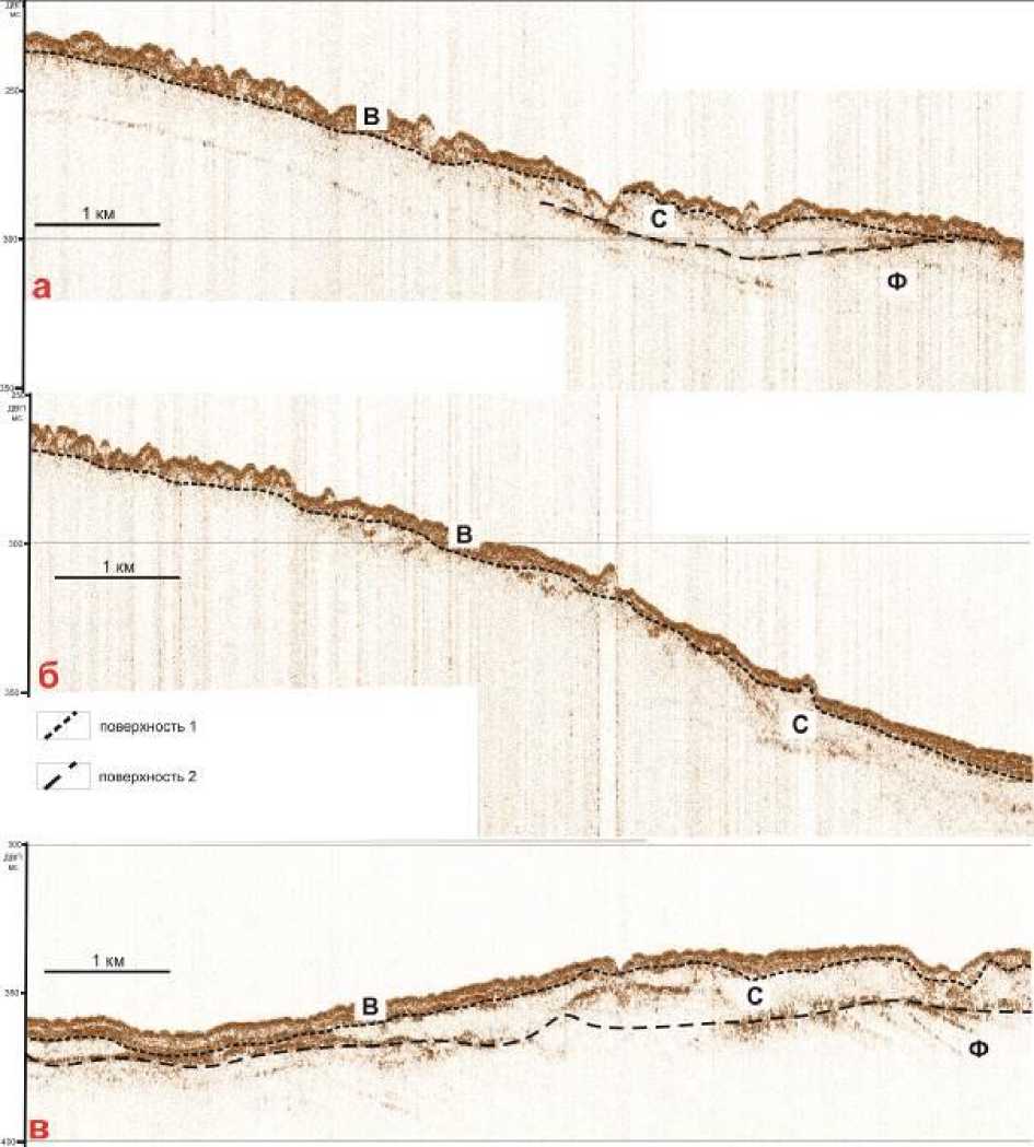 1. Анализ строения осадочной толщи по сейсмическим данным выявил три отдельных сейсмических комплекса, внутренняя структура которых не всегда типична для осадков ледникового типа. Хаотичная запись чаще просматривается в акустическом фундаменте (сейсмокомплекс Ф, предположительный возраст – мезозой и старше), в то время как четвертичные придонные осадки (сейсмокомплекс В, предположительный возраст – голоцен) показывают ярко выраженную слоистость. Каждый из них отличается большим разнообразием и значительной латеральной изменчивостью, особенно сейсмокомлекс С (предположительно четвертичного доголоценового возраста, по литературным данным, в том числе и поздний плейстоцен).