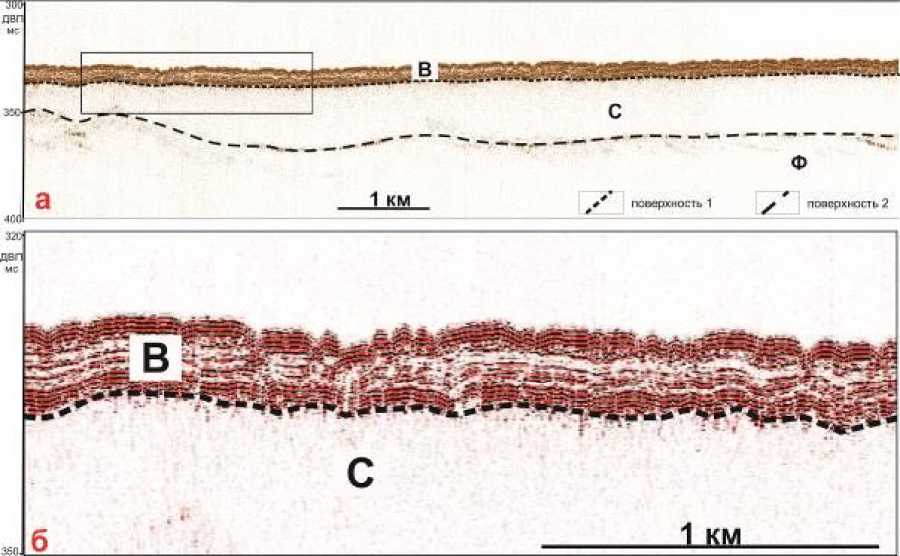 Рис. 6. Покмарки: а – сейсмоакустический профиль; б – сейсмоакустический профиль (крупно). Обозначены сейсмические комплексы В, С, Ф и разделяющие их поверхности (см. таблицу).