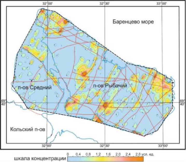 Проведенная в 2000-х гг. на полуостровах Средний и Рыбачий северной оконечности Балтийского щита аэрогазовая съемка по метану позволила обнаружить неоднородно распределенные в пространстве приповерхностные ореолы его концентрации ( Сорохтин и др., 2022 ). Выявленная неоднородность хорошо коррелируется с расположением основных линеаментов (глубинных разломов) на поверхности полуостровов Средний и Рыбачий (рис. 7) ( Сорохтин и др., 2022 ).