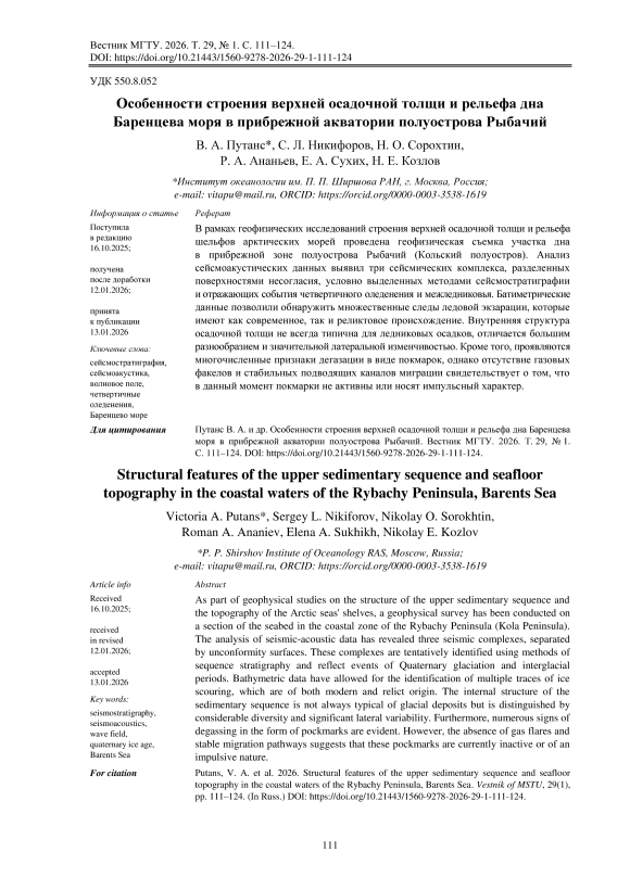 Victoria A. Putans*, Sergey L. Nikiforov, Nikolay O. Sorokhtin, Roman A. Ananiev, Elena A. Sukhikh, Nikolay E. Kozlov *P. P. Shirshov Institute of Oceanology RAS, Moscow, Russia; e-mail: , ORCID: Article info Received 16.10.2025; Abstract As part of geophysical studies on the structure of the upper sedimentary sequence and the topography of the Arctic seas' shelves, a geophysical survey has been conducted on received in revised 12.01.2026; a section of the seabed in the coastal zone of the Rybachy Peninsula (Kola Peninsula). The analysis of seismic-acoustic data has revealed three seismic complexes, separated by unconformity surfaces. These complexes are tentatively identified using methods of accepted 13.01.2026 sequence stratigraphy and reflect events of Quaternary glaciation and interglacial periods. Bathymetric data have allowed for the identification of multiple traces of ice Key words: seismostratigraphy, seismoacoustics, wave field, quaternary ice age, Barents Sea scouring, which are of both modern and relict origin. The internal structure of the sedimentary sequence is not always typical of glacial deposits but is distinguished by considerable diversity and significant lateral variability. Furthermore, numerous signs of degassing in the form of pockmarks are evident. However, the absence of gas flares and stable migration pathways suggests that these pockmarks are currently inactive or of an impulsive nature. For citation Putans, V. A. et al. 2026. Structural features of the upper sedimentary sequence and seafloor topography in the coastal waters of the Rybachy Peninsula, Barents Sea. Vestnik of MSTU, 29(1), pp. 111–124. (In Russ.) DOI: