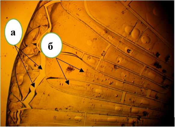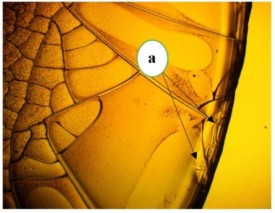 Рисунок 4 - Фрагмент суточной фации сыворотки крови больного теленка: частично радиальный тип; а - широкая неравномерная трещина; б -воронкообразные структуры в краевой зоне, ув. x 40.