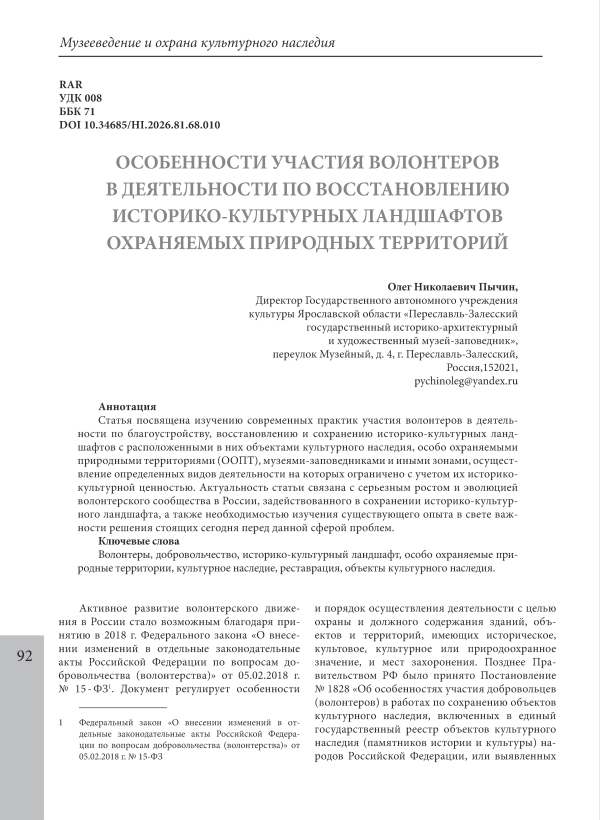 Статья посвящена изучению современных практик участия волонтеров в деятельности по благоустройству, восстановлению и сохранению историко-культурных ландшафтов с расположенными в них объектами культурного наследия, особо охраняемыми природными территориями (ООПТ), музеями-заповедниками и иными зонами, осуществление определенных видов деятельности на которых ограничено с учетом их историкокультурной ценностью. Актуальность статьи связана с серьезным ростом и эволюцией волонтерского сообщества в России, задействованного в сохранении историко-культурного ландшафта, а также необходимостью изучения существующего опыта в свете важности решения стоящих сегодня перед данной сферой проблем.