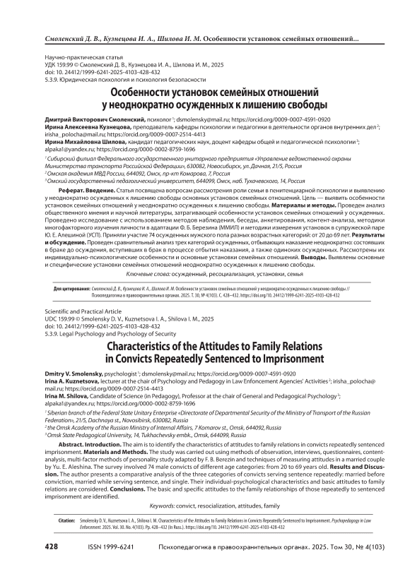 Введение. Статья посвящена вопросам рассмотрения роли семьи в пенитенциарной психологии и выявлению у неоднократно осужденных к лишению свободы основных установок семейных отношений. Цель — выявить особенности установок семейных отношений у неоднократно осужденных к лишению свободы. Материалы и методы. Проведен анализ общественного мнения и научной литературы, затрагивающей особенности установок семейных отношений у осужденных. Проведено исследование с использованием методов наблюдения, беседы, анкетирования, контент-анализа, методики многофакторного изучения личности в адаптации Ф. Б. Березина (ММИЛ) и методики измерения установок в супружеской паре Ю. Е. Алешиной (УСП). Приняли участие 74 осужденных мужского пола разных возрастных категорий: от 20 до 69 лет. Результаты и обсуждение. Проведен сравнительный анализ трех категорий осужденных, отбывающих наказание неоднократно: состоявших в браке до осуждения, вступивших в брак в процессе отбытия наказания, а также одиноких осужденных. Рассмотрены их индивидуально-психологические особенности и основные установки семейных отношений. Выводы. Выявлены основные и специфические установки семейных отношений неоднократно осужденных к лишению свободы.