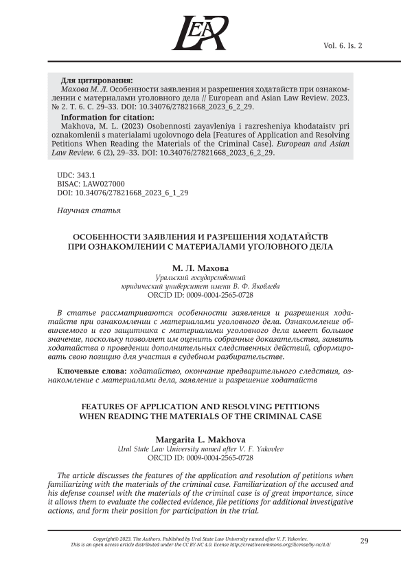 В статье рассматриваются особенности заявления и разрешения ходатайств при ознакомлении с материалами уголовного дела. Ознакомление обвиняемого и его защитника с материалами уголовного дела имеет большое значение, поскольку позволяет им оценить собранные доказательства, заявить ходатайства о проведении дополнительных следственных действий, сформировать свою позицию для участия в судебном разбирательстве.