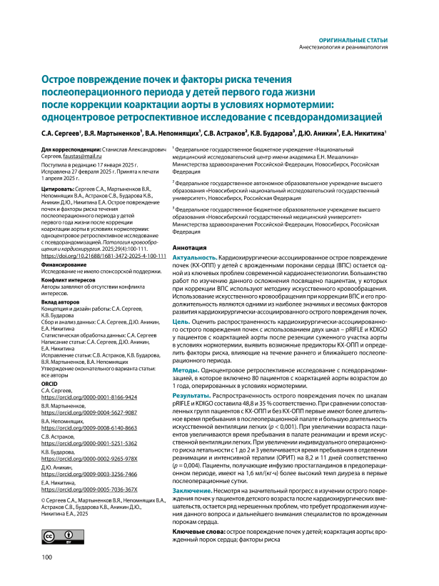 Острое повреждение почек и факторы риска течения послеоперационного периода у детей первого года жизни после коррекции коарктации аорты в условиях нормотермии: одноцентровое ретроспективное исследование с псевдорандомизацией