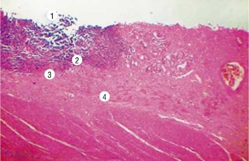 Рис. 7. Гистологическое строение участка стенки тонкой кишки с острой язвой (1) и наличием тромбоза мелких сосудов (3) в зоне воспаления (2, 4).
