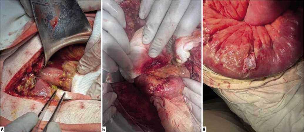 Рис. 8. «Заплата» места ушивания перфораций (А) тонкой кишки (Б) участком неизмененной париетальной брюшины (В).