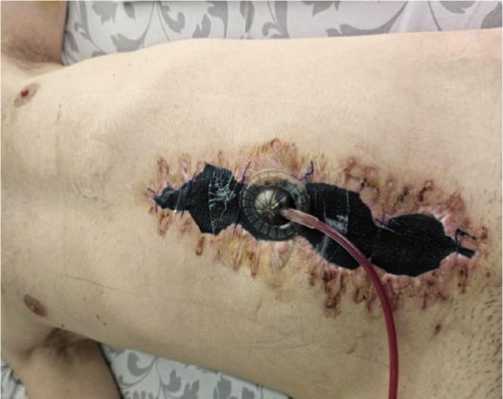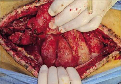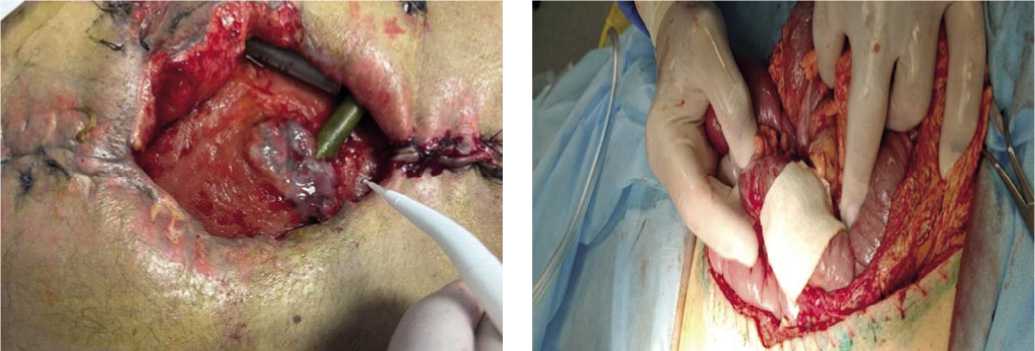 Рис. 13. Вакуум – ассистированная лапаротомия при лечении огнестрельного распространенного перитонита.