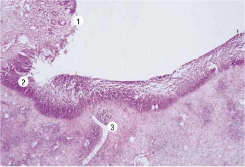Рис. 11. Гистологическое строение стенки резецированного ульцеронесущего участка тонкой кишки (истончение слизистого и подслизистого слоя (1) с участком некроза (2) и бактериальной транслокацией (3)).