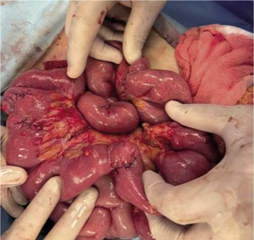 Рис. 12. Ушитые множественные десерозированные участки тонкой кишки, возникшие при адгезиолизисе, и ее интубации назоинтестинальным зондом Миллера-Эббота.
