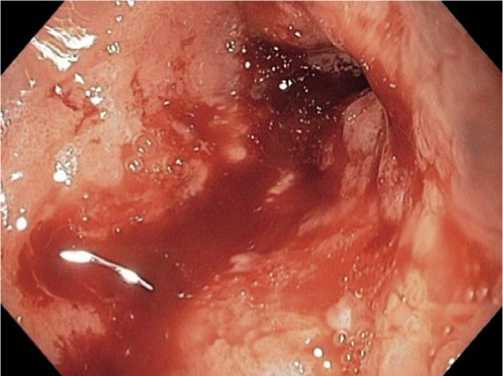 Рис. 2. Энтероскопическая диагностика острых язв тонкой кишки, осложненных кровотечением.