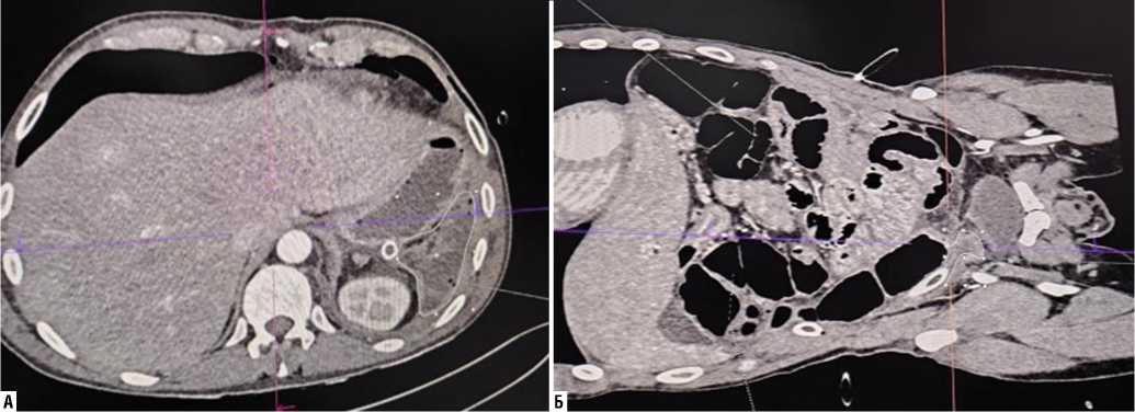 Рис. 4. МСКТ брюшной полости с контрастированием при перфорации острой язвы тонкой кишки (наличие газа, свободной жидкости (А), дефекты стенки тонкой кишки (Б)).
