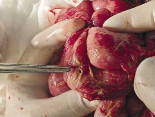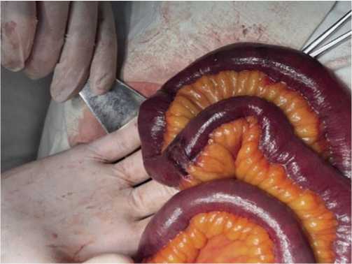 Рис. 6. Некротизированный участок тонкой кишки с перфорацией и распространенным перитонитом.