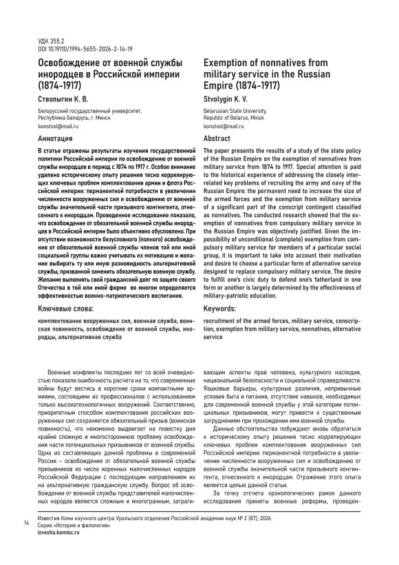 The paper presents the results of a study of the state policy of the Russian Empire on the exemption of nonnatives from military service from 1874 to 1917. Special attention is paid to the historical experience of addressing the closely interrelated key problems of recruiting the army and navy of the Russian Empire: the permanent need to increase the size of the armed forces and the exemption from military service of a significant part of the conscript contingent classified as nonnatives. The conducted research showed that the exemption of nonnatives from compulsory military service in the Russian Empire was objectively justified. Given the impossibility of unconditional (complete) exemption from compulsory military service for members of a particular social group, it is important to take into account their motivation and desire to choose a particular form of alternative service designed to replace compulsory military service. The desire to fulfill one’s civic duty to defend one’s fatherland in one form or another is largely determined by the effectiveness of military-patriotic education.