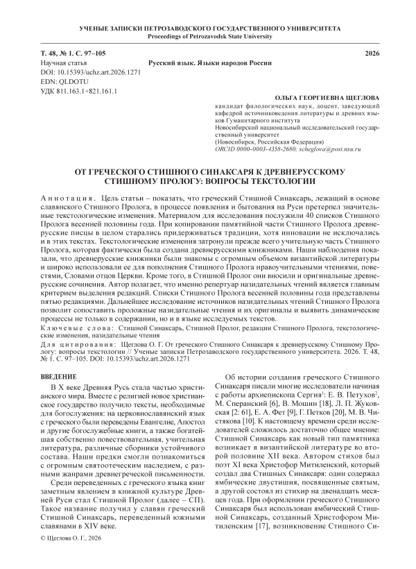 Цель статьи – показать, что греческий Стишной Синаксарь, лежащий в основе славянского Стишного Пролога, в процессе появления и бытования на Руси претерпел значительные текстологические изменения. Материалом для исследования послужили 40 списков Стишного Пролога весенней половины года. При копировании памятийной части Стишного Пролога древнерусские писцы в целом старались придерживаться традиции, хотя инновации не исключались и в этих текстах. Текстологические изменения затронули прежде всего учительную часть Стишного Пролога, которая фактически была создана древнерусскими книжниками. Наши наблюдения показали, что древнерусские книжники были знакомы с огромным объемом византийской литературы и широко использовали ее для пополнения Стишного Пролога нравоучительными чтениями, повестями, Словами отцов Церкви. Кроме того, в Стишной Пролог они вносили и оригинальные древнерусские сочинения. Автор полагает, что именно репертуар назидательных чтений является главным критерием выделения редакций. Списки Стишного Пролога весенней половины года представлены пятью редакциями. Дальнейшее исследование источников назидательных чтений Стишного Пролога позволит сопоставить проложные назидательные чтения и их оригиналы и выявить динамические процессы не только в содержании, но и в языке исследуемых текстов.