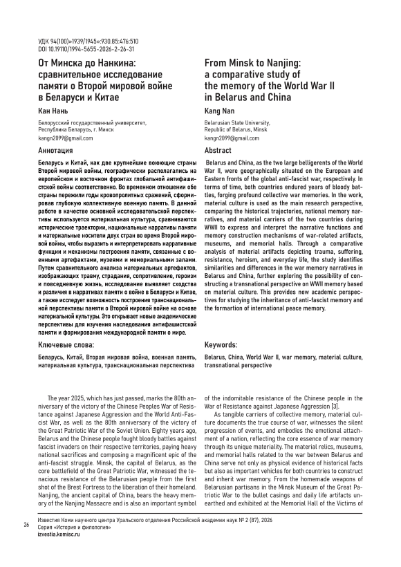 Беларусь и Китай, как две крупнейшие воюющие страны Второй мировой войны, географически располагались на европейском и восточном фронтах глобальной антифашистской войны соответственно. Во временном отношении обе страны пережили годы кровопролитных сражений, сформировав глубокую коллективную военную память. В данной работе в качестве основной исследовательской перспективы используется материальная культура, сравниваются исторические траектории, национальные нарративы памяти и материальные носители двух стран во время Второй мировой войны, чтобы выразить и интерпретировать нарративные функции и механизмы построения памяти, связанные с военными артефактами, музеями и мемориальными залами. Путем сравнительного анализа материальных артефактов, изображающих травму, страдания, сопротивление, героизм и повседневную жизнь, исследование выявляет сходства и различия в нарративах памяти о войне в Беларуси и Китае, а также исследует возможность построения транснациональной перспективы памяти о Второй мировой войне на основе материальной культуры. Это открывает новые академические перспективы для изучения наследования антифашистской памяти и формирования международной памяти о мире.