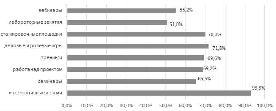 Следующая группа вопросов касалась наиболее значимых для слушателей форм обучения. Высокий уровень эффективности по мнению респондентов имеют интерактивные лекции, стажировочные площадки, использование деловых и ролевых игр, тренингов и проектной работы, что представлено на рисунке 1.