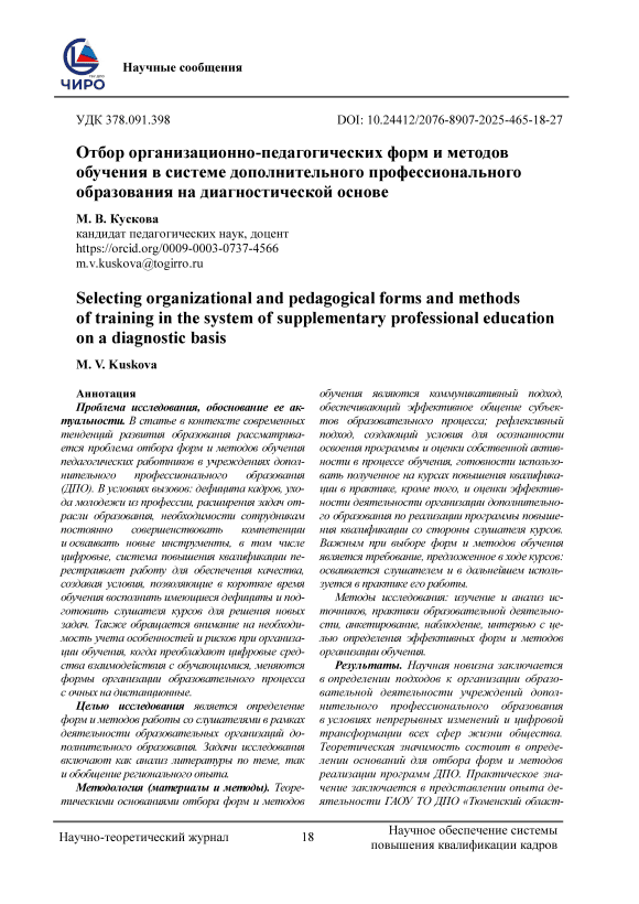 Проблема исследования, обоснование ее актуальности. В статье в контексте современных тенденций развития образования рассматривается проблема отбора форм и методов обучения педагогических работников в учреждениях дополнительного профессионального образования (ДПО). В условиях вызовов: дефицита кадров, ухода молодежи из профессии, расширения задач отрасли образования, необходимости сотрудникам постоянно совершенствовать компетенции и осваивать новые инструменты, в том числе цифровые, система повышения квалификации перестраивает работу для обеспечения качества, создавая условия, позволяющие в короткое время обучения восполнить имеющиеся дефициты и подготовить слушателя курсов для решения новых задач. Также обращается внимание на необходимость учета особенностей и рисков при организации обучения, когда преобладают цифровые средства взаимодействия с обучающимися, меняются формы организации образовательного процесса с очных на дистанционные. Целью исследования является определение форм и методов работы со слушателями в рамках деятельности образовательных организаций дополнительного образования. Задачи исследования включают как анализ литературы по теме, так и обобщение регионального опыта. Методология (материалы и методы). Теоретическими основаниями отбора форм и методов обучения являются коммуникативный подход, обеспечивающий эффективное общение субъектов образовательного процесса; рефлексивный подход, создающий условия для осознанности освоения программы и оценки собственной активности в процессе обучения, готовности использовать полученное на курсах повышения квалификации в практике, кроме того, и оценки эффективности деятельности организации дополнительного образования по реализации программы повышения квалификации со стороны слушателя курсов. Важным при выборе форм и методов обучения является требование, предложенное в ходе курсов: осваивается слушателем и в дальнейшем используется в практике его работы. Методы исследования: изучение и анализ источников, практики образовательной деятельности, анкетирование, наблюдение, интервью с целью определения эффективных форм и методов организации обучения. Результаты. Научная новизна заключается в определении подходов к организации образовательной деятельности учреждений дополнительного профессионального образования в условиях непрерывных изменений и цифровой трансформации всех сфер жизни общества. Теоретическая значимость состоит в определении оснований для отбора форм и методов реализации программ ДПО. Практическое значение заключается в представлении опыта деятельности ГАОУ ТО ДПО «Тюменский областной государственный институт развития регионального образования» (ТОГИРРО) и рекомендаций, которые могут использоваться образовательными учреждениями, занимающимися повышением квалификации.