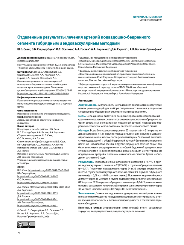 Актуальность. Актуальность исследования заключается в отсутствии четких рекомендаций для выбора оперативного лечения у пациентов с подвздошно-бедренными окклюзионными поражениями. Цель. Цель данного пилотного рандомизированного исследования – сравнение отдаленных результатов эндоваскулярного и гибридного лечения сочетанных окклюзионных поражений артерий подвздошно-бедренного сегмента с использованием плетеного нитинолового стента. Методы. Всего были рандомизированы 62 пациента (n = 31 в группе эндоваскулярного, n = 31 в группе гибридного лечения). В группе эндоваскулярного лечения пациентам после реканализации и баллонной ангиопластики подвздошной и общей бедренной артерий были имплантированы плетеные нитиноловые стенты. В группе гибридного лечения пациентам были выполнены эндартерэктомия из общей бедренной артерии с пластикой заплатой из ксеноперикарда, реканализация и стентирование подвздошных артерий с плетеным нитиноловым стентом. Время наблюдения составило 3 года. Результаты. Тридцатидневные осложнения составили 3 (9,7 %) в группе эндоваскулярного лечения и 7 (22,6 %) в группе гибридного лечения (р = 0,17). Первичная проходимость через 24 и 36 месяцев составила 60 и 46 % в группе эндоваскулярного лечения, 80 и 73 % в группе гибридного лечения (p = 0,09 и p = 0,03 соответственно). Показатели вторичной проходимости через 36 месяцев в группе эндоваскулярного лечения составили 83 % против 87 % в группе гибридного лечения (р = 0,64). Уровни выживаемости и сохранения конечностей не различались между группами через 36 месяцев наблюдения (р = 0,97 и р = 0,31 соответственно). Заключение. Данное исследование подтверждает, что гибридное лечение имеет преимущество перед эндоваскулярным стентированием с точки зрения безопасности и первичной проходимости в трехлетнем периоде наблюдения.
