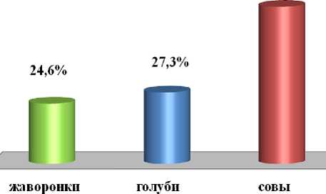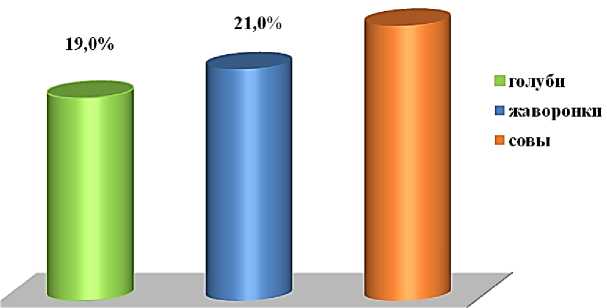 По результатам анкетирования были определены три группы студентов с разным хронотипом: утренний (жаворонки), промежуточный или аритмичный (голуби) и вечерний (совы) (Рисунок 1).