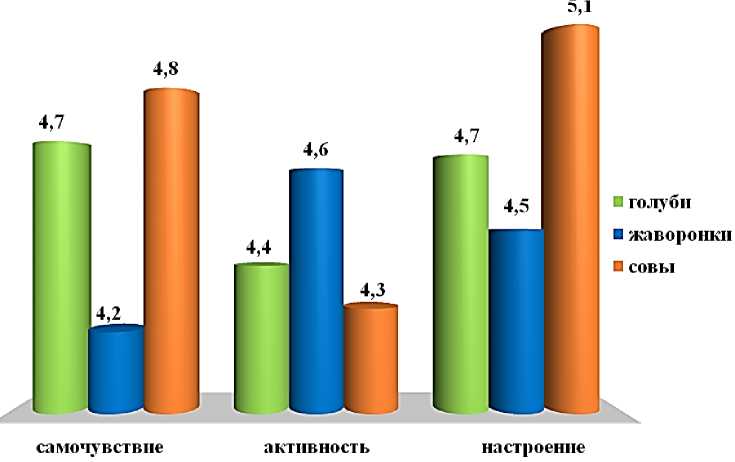 Анализ имеющихся данных позволяет предположить, что в условиях текущей организации учебного процесса хронотип «голуби» ассоциирован с более высокой академической успеваемостью по сравнению с хронотипами «совы» и «жаворонки». Обучающиеся с промежуточным хронотипом, или «голуби», лучше всего приспособлены к стандартному суточному распорядку и бодрствованию днем. Пик их умственной и физической активности приходится на дневные часы, что может положительно сказываться на их успеваемости в учебе. При изучении посещаемости занятий, мы выявили, что случаи пропуска одного занятия отмечаются у студентов с хронотипом голуби (80,1%). В свою очередь, хронотип «жаворонки» продемонстрировал более высокую посещаемость: лишь 68,4% респондентов этой группы имели один пропуск занятия. Обучающиеся с хронотипом «совы» показали промежуточные значения, где 78,3% имели один пропуск. На основании данных исследования можно предположить, что студенты с разными хронотипами имеют неодинаковый подход к учёбе. «Жаворонки», как правило, более дисциплинированны и организованы, что сказывается на их посещаемости. Даже при наличии высоких показателей успеваемости у студентов с хронотипом «голубь», могут возникать проблемы с мотивацией и управлением временем. Таким образом, циркадные ритмы могут оказывать определенное влияние на учебные показатели. Это свидетельствует о необходимости дальнейшего изучения механизмов влияния хронотипов для возможной адаптации образовательных подходов и графиков. Для оперативной оценки функционального состояния организма использовался тест САН. Углубленный анализ полученных данных позволил установить, что средний балл по шкале «Самочувствие» для хронотипа «голуби» составил 4,7 (превышение 4 баллов) (Рисунок 2).