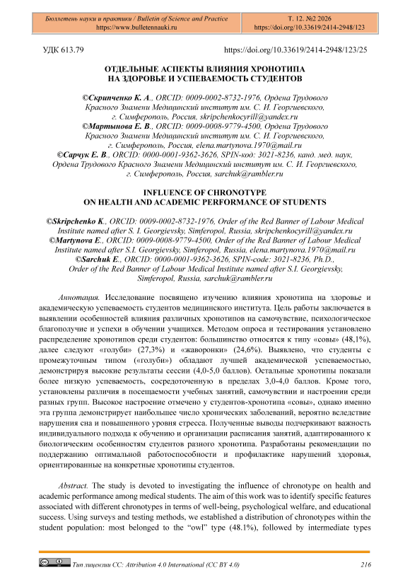 Исследование посвящено изучению влияния хронотипа на здоровье и академическую успеваемость студентов медицинского института. Цель работы заключается в выявлении особенностей влияния различных хронотипов на самочувствие, психологическое благополучие и успехи в обучении учащихся. Методом опроса и тестирования установлено распределение хронотипов среди студентов: большинство относятся к типу «совы» (48,1%), далее следуют «голуби» (27,3%) и «жаворонки» (24,6%). Выявлено, что студенты с промежуточным типом («голуби») обладают лучшей академической успеваемостью, демонстрируя высокие результаты сессии (4,0-5,0 баллов). Остальные хронотипы показали более низкую успеваемость, сосредоточенную в пределах 3,0-4,0 баллов. Кроме того, установлены различия в посещаемости учебных занятий, самочувствии и настроении среди разных групп. Высокое настроение отмечено у студентов-хронотипа «совы», однако именно эта группа демонстрирует наибольшее число хронических заболеваний, вероятно вследствие нарушения сна и повышенного уровня стресса. Полученные выводы подчеркивают важность индивидуального подхода к обучению и организации расписания занятий, адаптированного к биологическим особенностям студентов разного хронотипа. Разработаны рекомендации по поддержанию оптимальной работоспособности и профилактике нарушений здоровья, ориентированные на конкретные хронотипы студентов.
