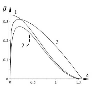 Полученная с помощью «механического подхода» открытая космологическая модель имеет два управляющих параметра α и f 0 , позволяющих менять поведение модели (Рис.1). Например, для кривой 1 в точке z = 0 (начало процесса расширения Вселенной) выполняется ультрареля-тивистское уравнение состояния (р = e/3), то есть массовая материя отсутствует и реализуется модель «электромагнитной Вселенной» (Вселенной, заполненной безмассовой материей), когда оба параметра равны нулю. Если «включить» параметр, отвечающий за наличие массовой материи, то есть взять а > 0, то такая модель, заполненная как массовой, так и безмассовой материей, соответствует кривой 2 с максимумом ниже ультрарелятивистского состояния. Однако «включение» еще и положительного «силового параметра» f o > 0 (кривая 3) приводит к эффекту «компенсации» присутствия массовой материи (сравни кривые 2 и 3).